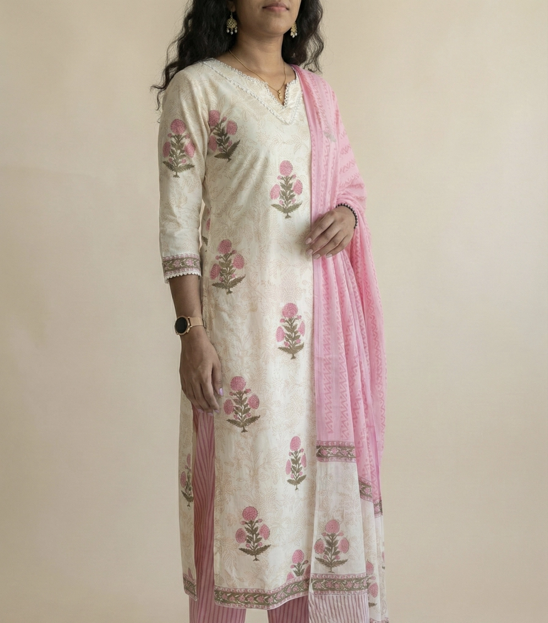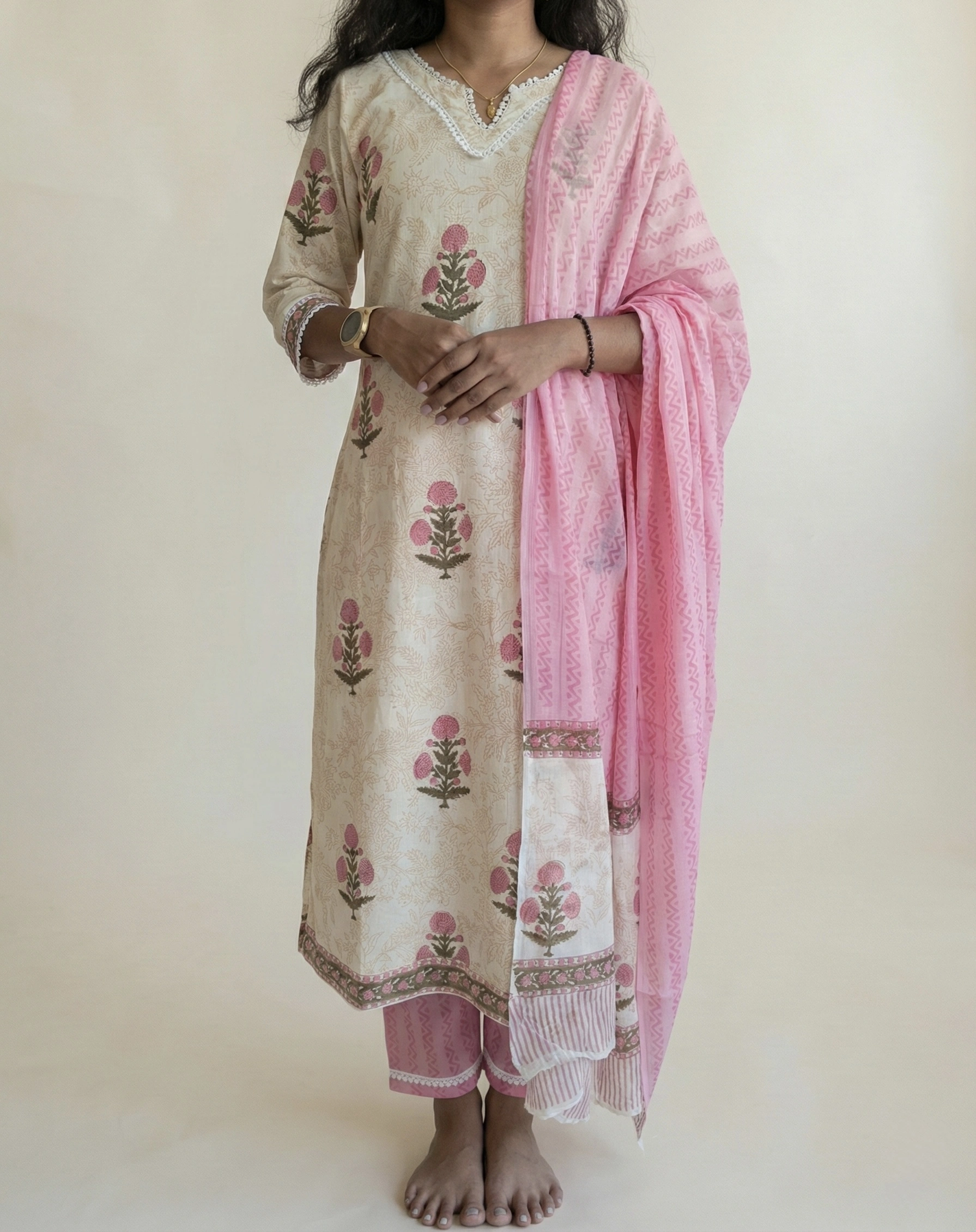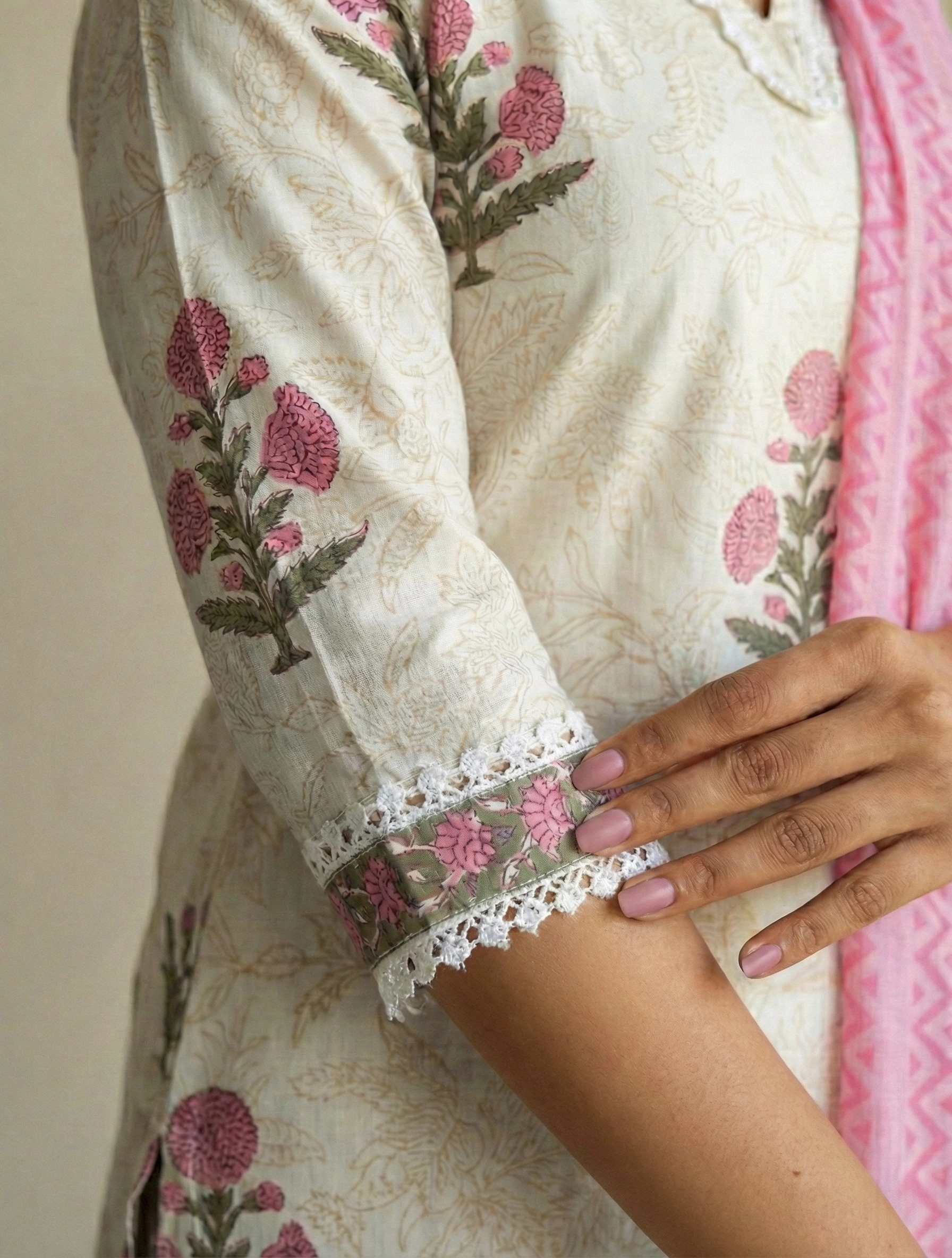Blush Bloom Cotton Hand Block Print Suit Set. The lightweight fabric makes it ideal for all-day wear — whether you're heading to work, a casual gathering, or a festive daytime event. Each piece carries slight print variations, a signature of authentic hand block craftsmanship, making your outfit truly one of a kind.