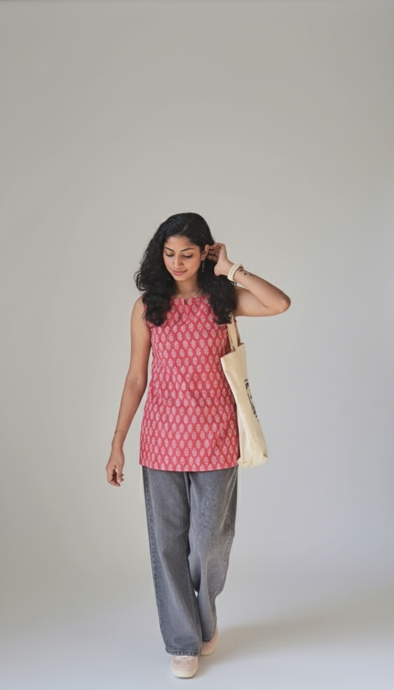 Add a bold and beautiful touch to your wardrobe with the MIRAY Women's Sleeveless Cotton Kurti in a vibrant Red hand block printed design. Made from premium quality breathable cotton, this sleeveless kurti is a perfect blend of comfort and style. The modern cut with a notch neckline offers a chic and minimalist look, ideal for daily wear, college, or semi-formal events.