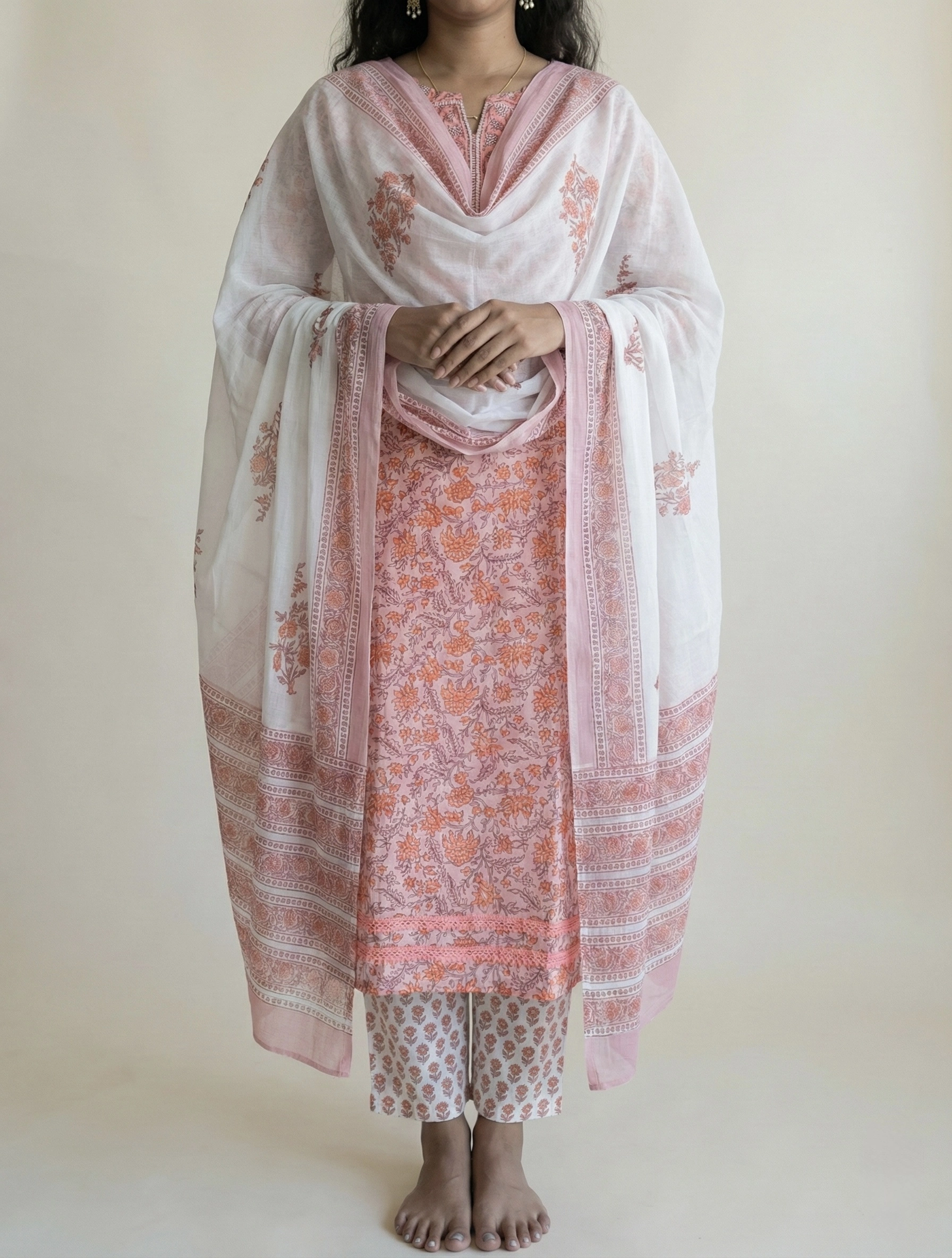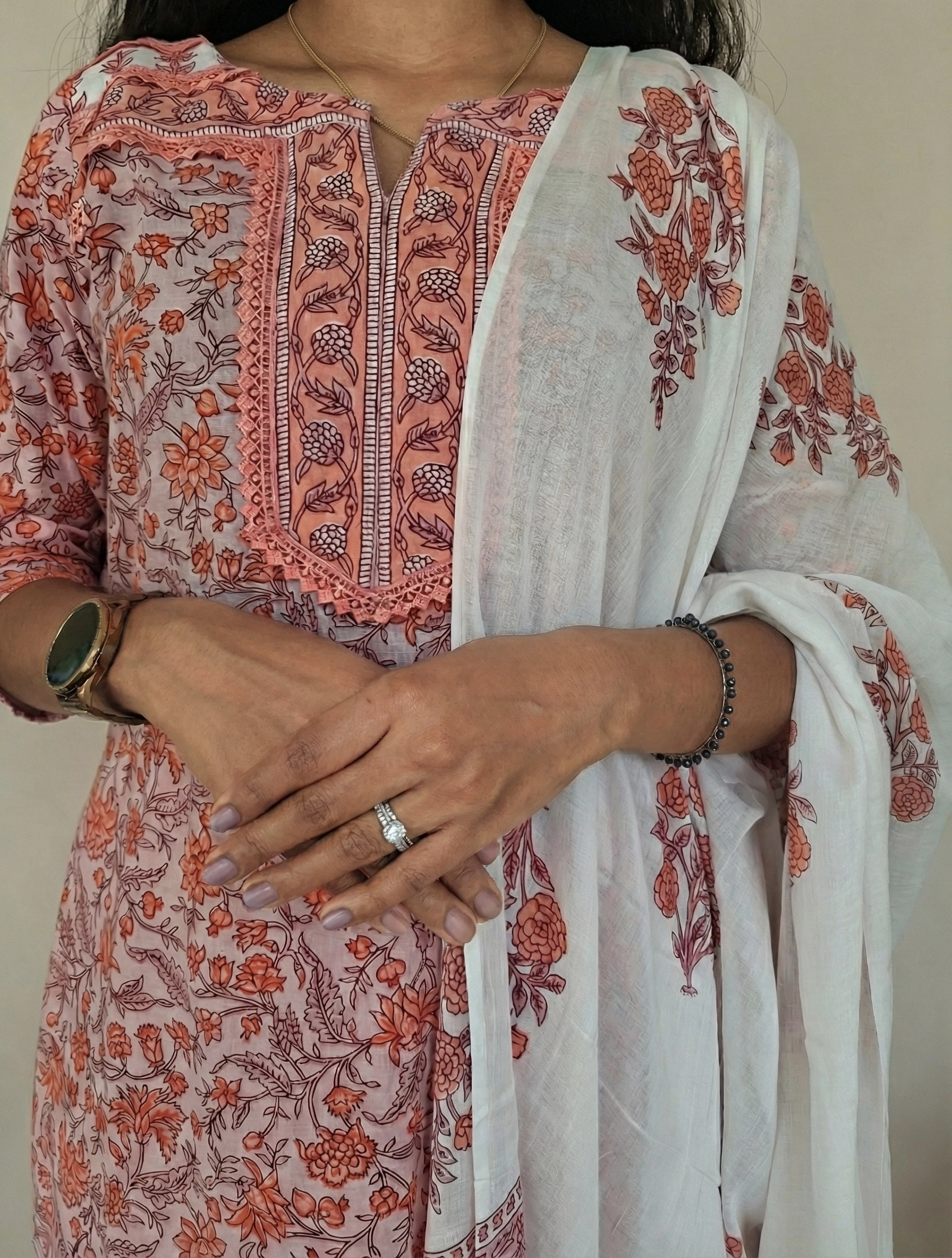 Embrace effortless elegance with our Peach Floral Hand-Block Cotton Suit Set. This 3-piece ensemble is a tribute to traditional Indian craftsmanship, featuring intricate hand-carved block prints on premium, breathable cotton.