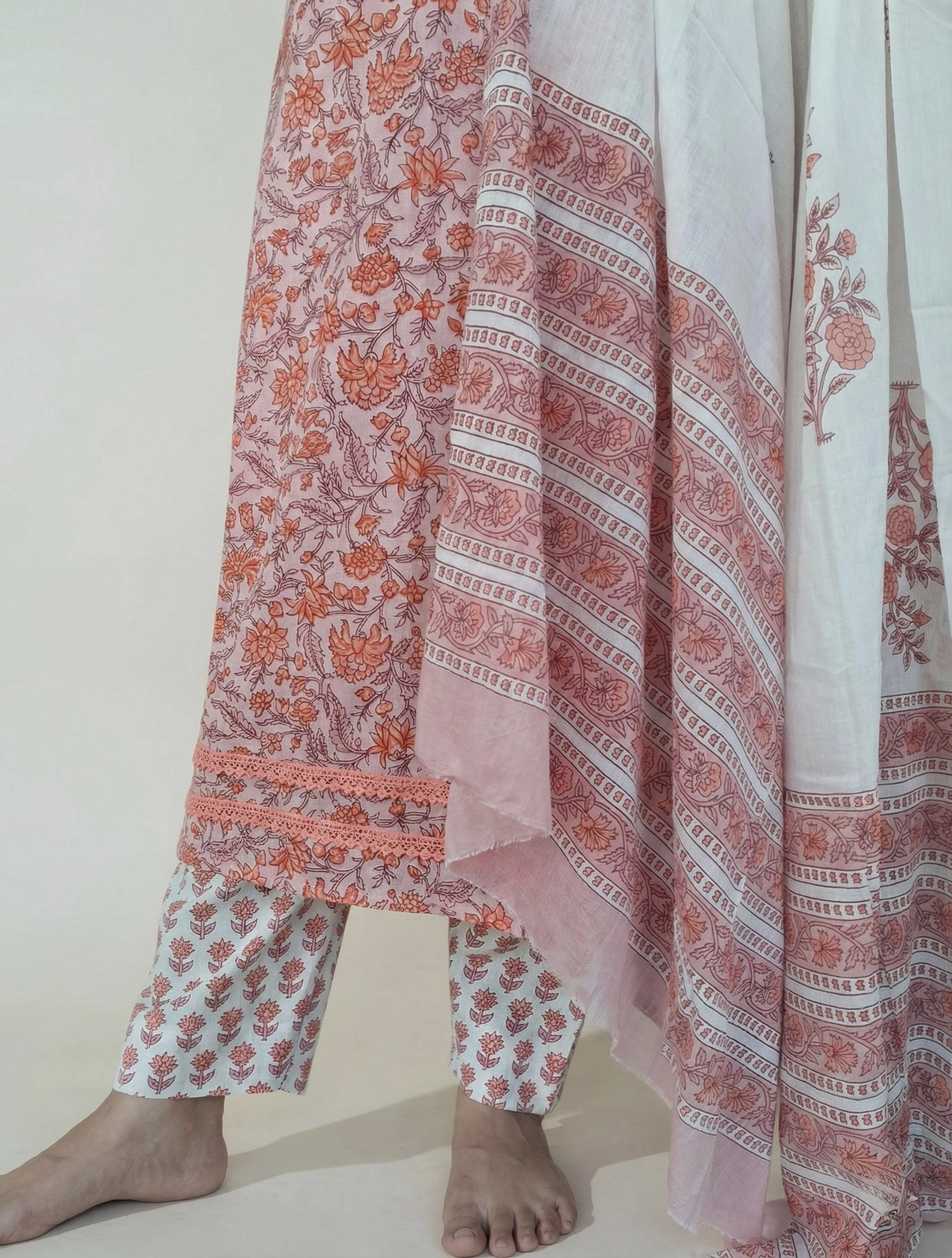 Peach Floral Hand-Block Print Pure Cotton Suit Set with Dupatta